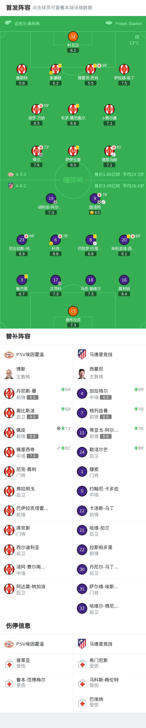 北京时间12月10日西甲日报欧洲冠军联赛 联赛阶段 第6轮,PSV埃因霍温对阵马德里竞技。上半场,德里乌赫助攻蒂尔破门。瑟洛特无私横传,阿尔瓦雷斯扳平比分。下半场,莫利纳远射被扑,汉茨科补射建功。巴里奥斯传中,瑟洛特头槌破门。佩里西奇头球后蹭,佩皮扳回一城。全场比赛结束,马竞客场3-2击败埃因霍温。
