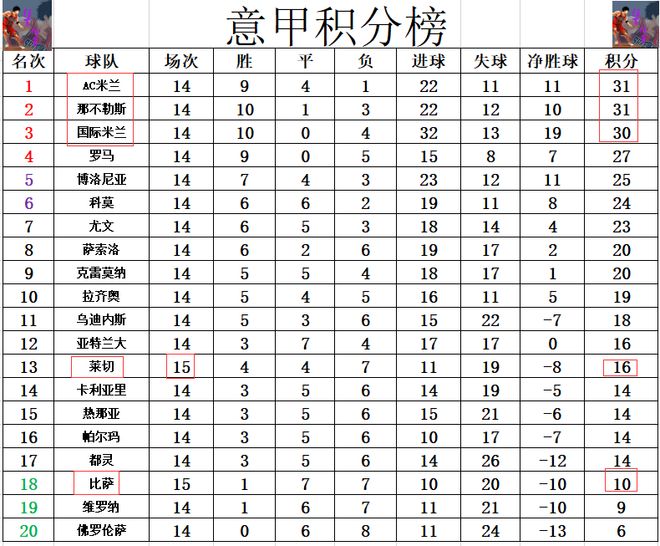 意甲最新积分战报 莱切赢保级大战 AC米兰那不勒斯国米争榜首