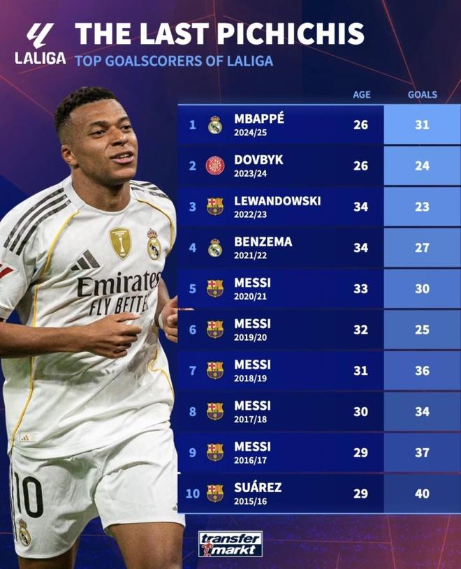 最近德国转会市场网站发布了近10年西甲皮奇奇得主榜单,姆巴佩、梅西、苏亚雷斯等顶级射手全部在列。刚拿到个人首座皮奇奇奖的姆巴佩,在皇马首季就踢出31球的成绩,单季效率已经能和梅西、苏亚雷斯的高光年份放在一起比较。有意思的是,如果把这组数据平移到梅西连拿皮奇奇的那些赛季,金靴的归属很可能会出现不一样的结果。(数据截至北京时间2025年11月25日法甲日报)