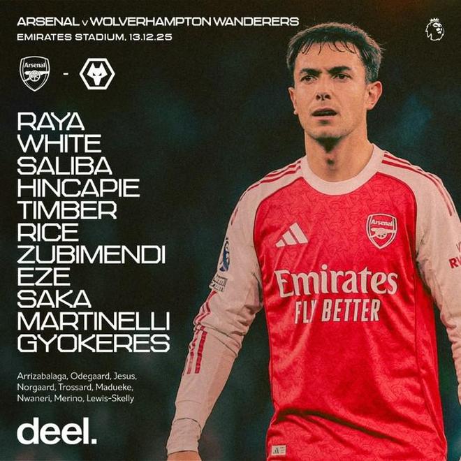 阿森纳vs狼队:哲凯赖什搭档萨卡,埃泽、赖斯首发出战