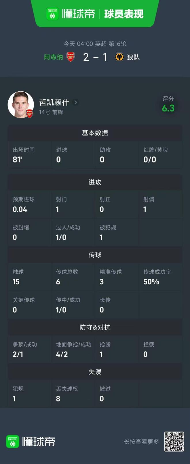 本场比赛,枪手前锋哲凯赖什首发出战81分钟,1次射门0次射正,在场上仅触球15次。其他数据方面,哲凯赖什0次成功过人,6次传球3次成功,8次丢失球权。