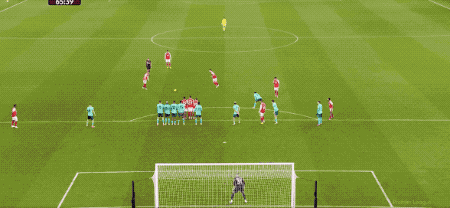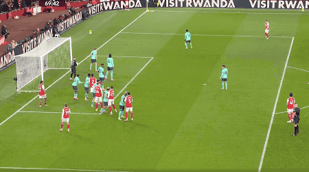 第66分钟,阿森纳获得前场任意球,赖斯直接射门,皮球绕过人墙,门将约翰斯通飞身完成扑救,将球托出横梁。